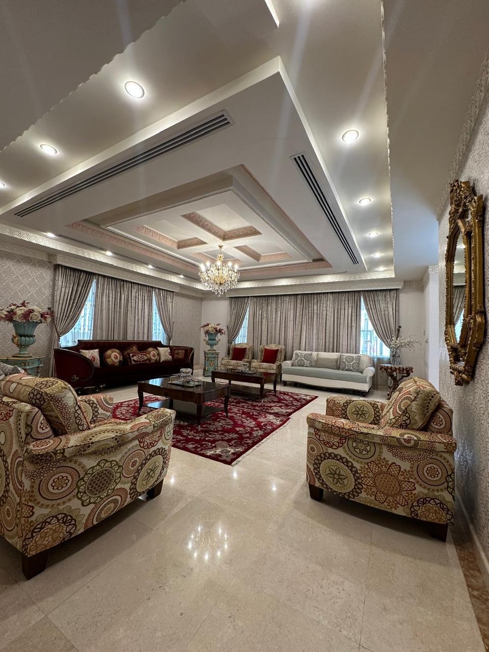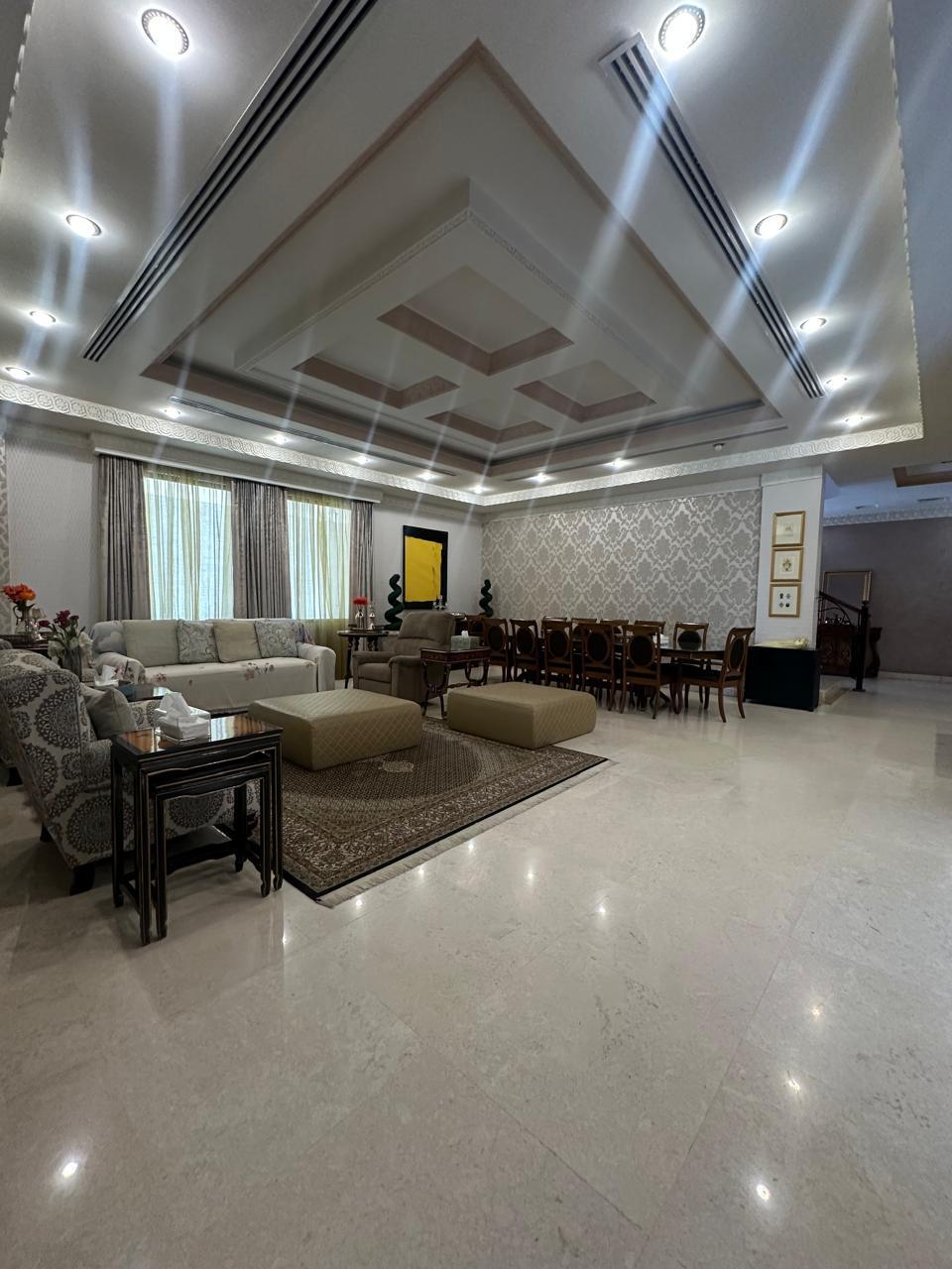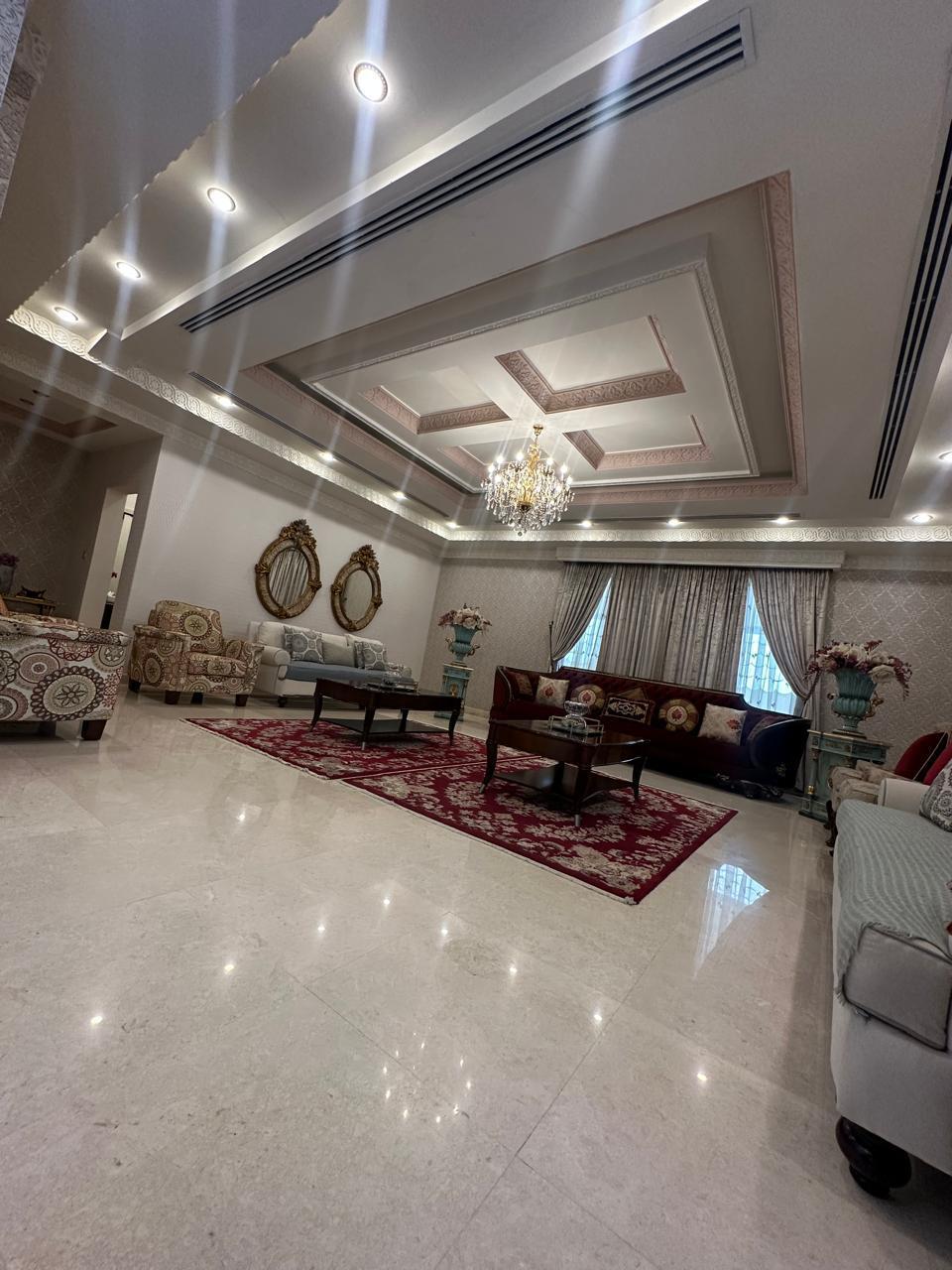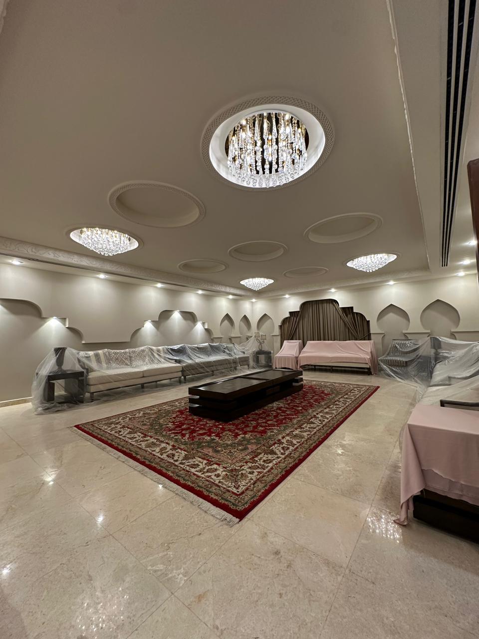 (عدد ٢ صالات ضيوف كبيرة وحدتين تكييف مركزي + ٢ مطبخ واحد تحضير والآخر للطبخ+ غرفة ضيوف بحمام + غرفة شغالة بحمام + غرفة غسيل+ مخزن كبير للمطبخ + تكييف مخفي).