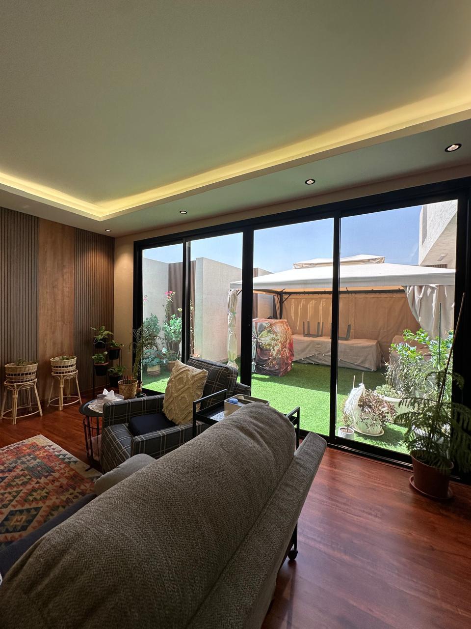(مسبح + صالة + حمامين + غرفة فلاتر + واجهة المونيوم 10م على الحوش وباب المونيوم + صالة + غرفة + مطبخ صغير + مجلس كبيرة + مغاسل + حمام + باب للحوش الخارجي+ تكييف سبيلت مخفي).